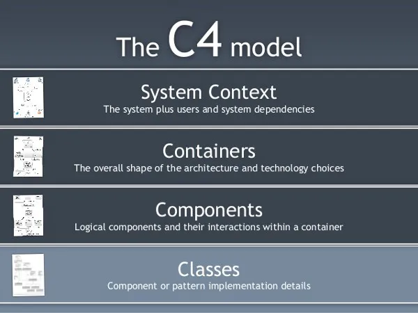 The “C4 model” is a simple hierarchical way to think about the static structures of a software system in terms of containers*,* components and classes (or code*).*